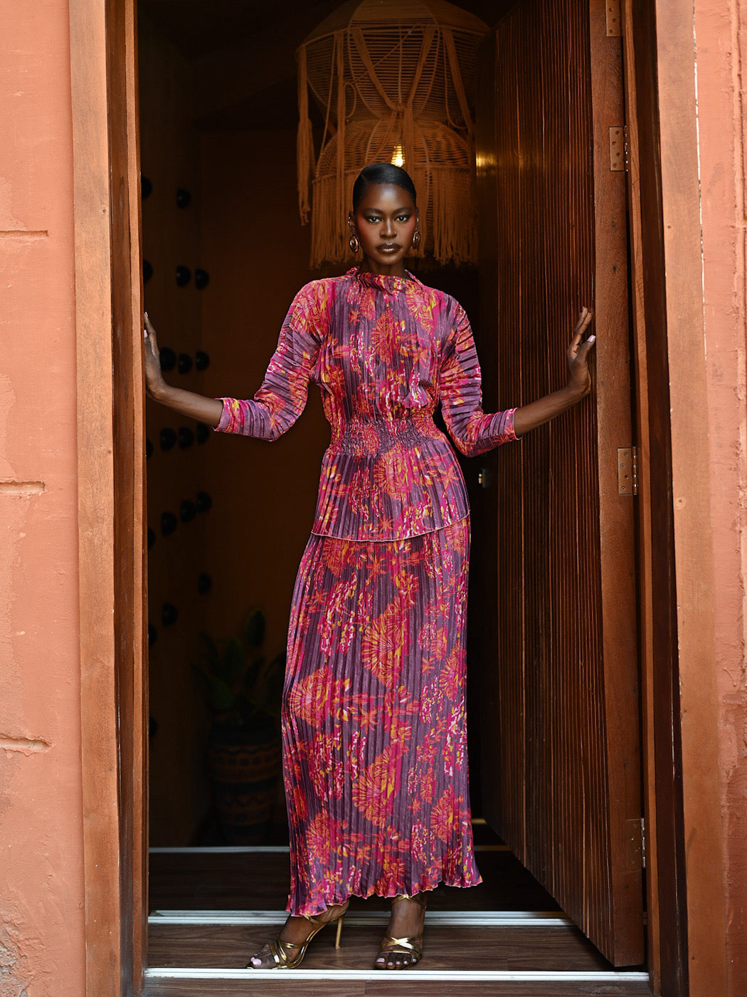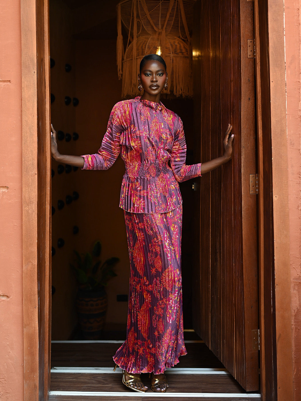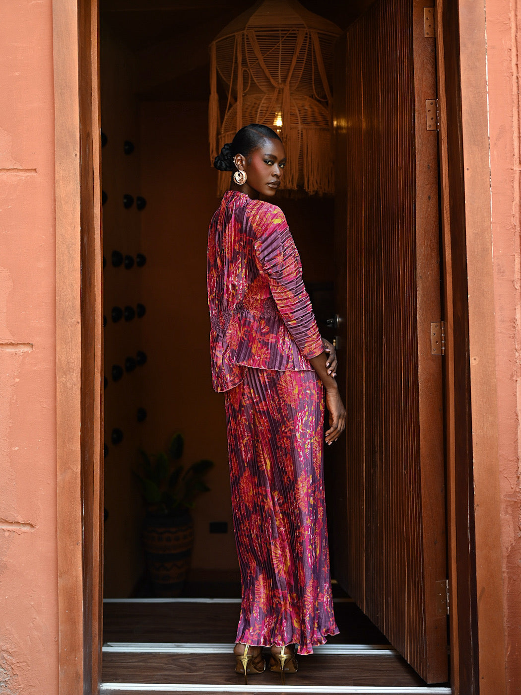 The AMA Ensemble requires minimal styling, as the print and texture provide all the drama needed. Pair it with metallic gold heels (as shown) and delicate earrings. Perfect for cocktail receptions, milestone celebrations, sophisticated resort wear, or festive gatherings.