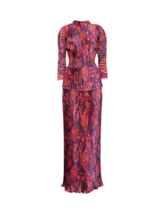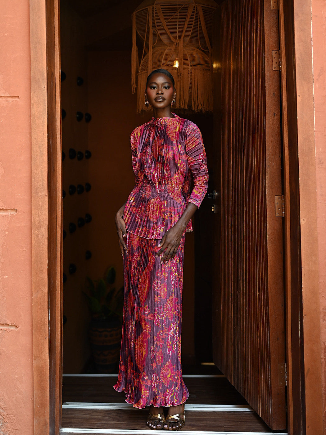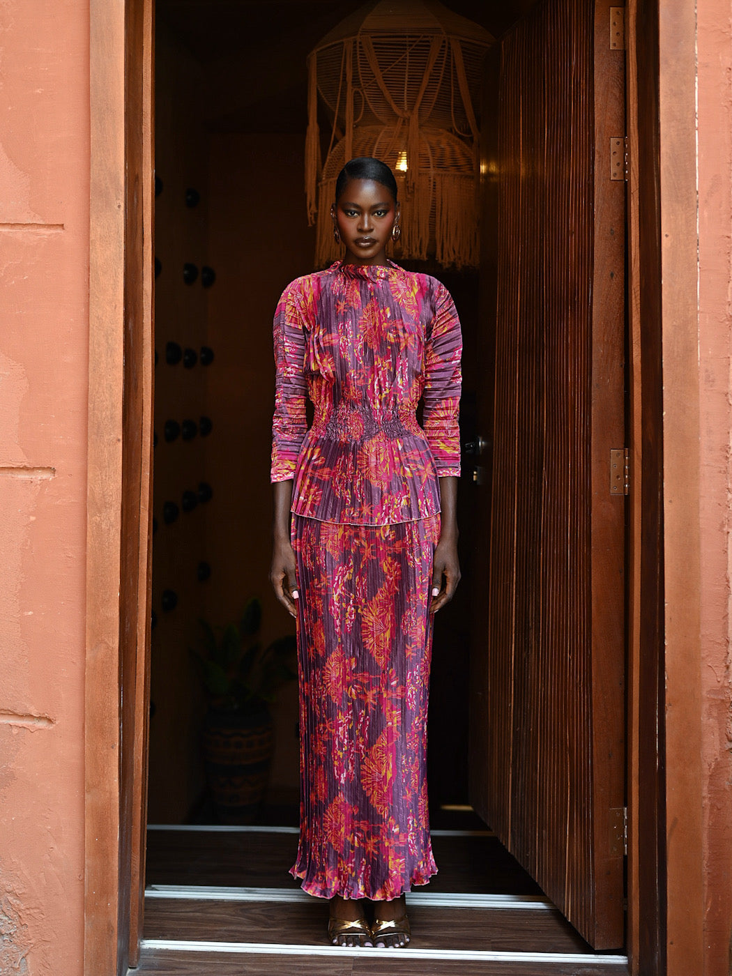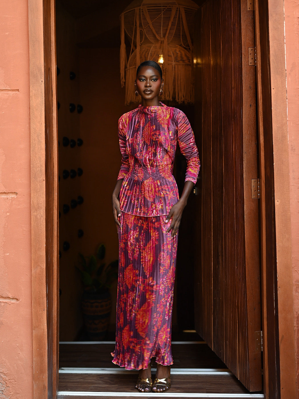 The AMA Ensemble requires minimal styling, as the print and texture provide all the drama needed. Pair it with metallic gold heels (as shown) and delicate earrings. Perfect for cocktail receptions, milestone celebrations, sophisticated resort wear, or festive gatherings.