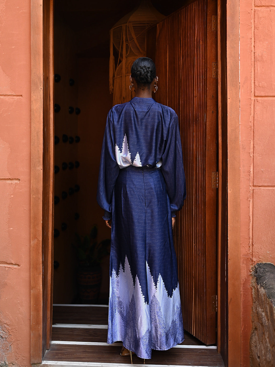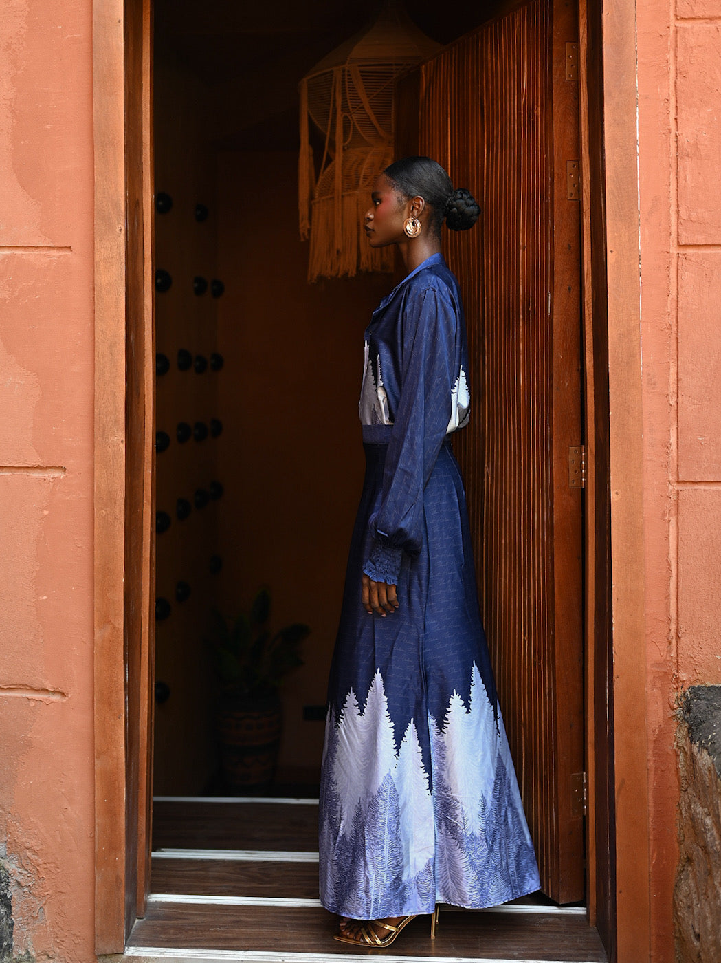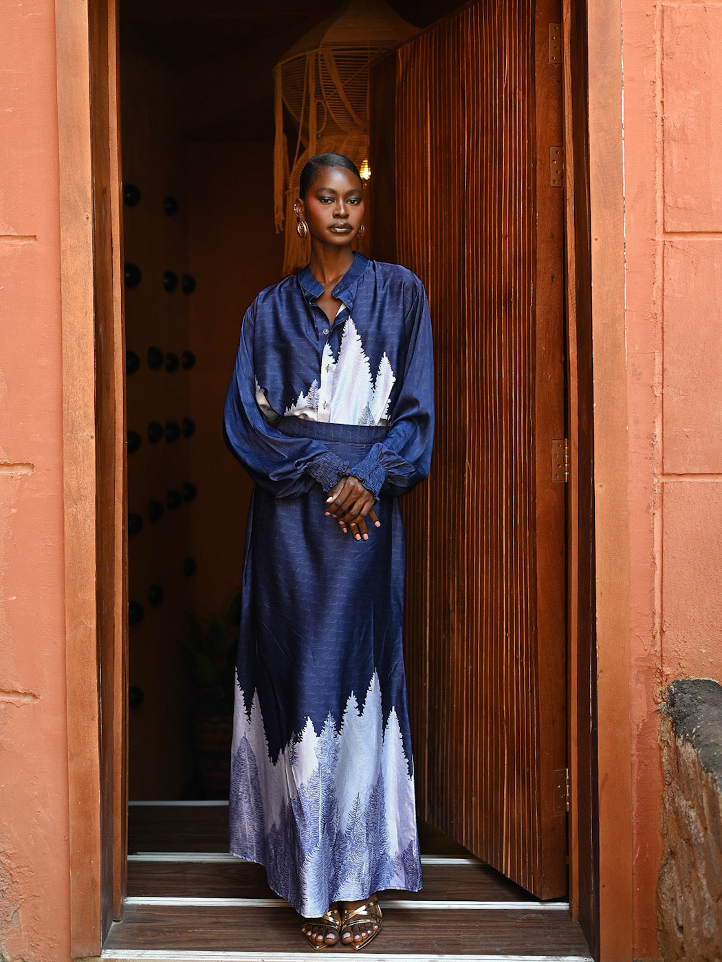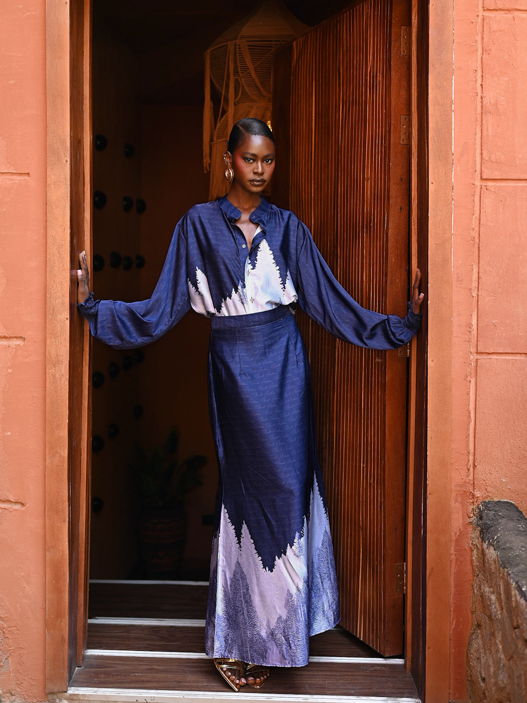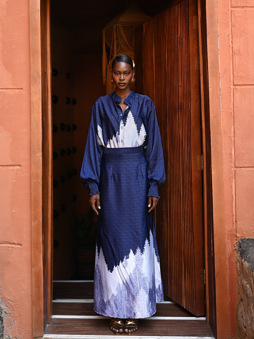 The LIORA Ensemble a visually arresting two-piece set named for its inherent radiance and sophistication. Featuring a dramatic, landscape-inspired print, this skirt and top seamlessly blend the comfort of a relaxed shirt with the elegance of a maxi skirt, offering a unique fusion of artistry and wearability.